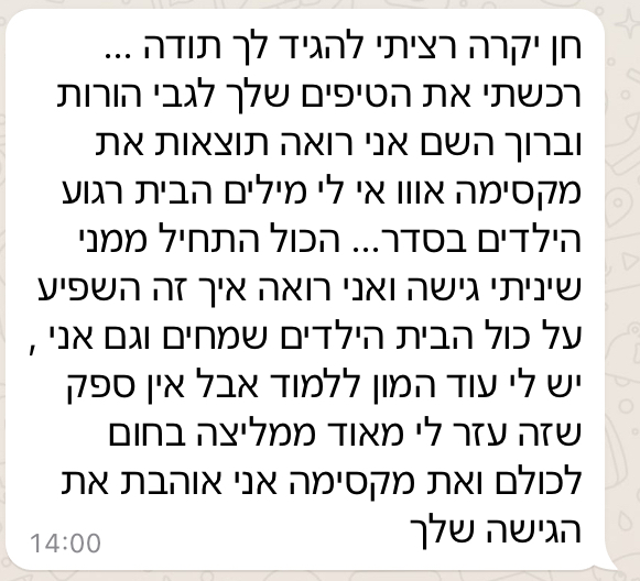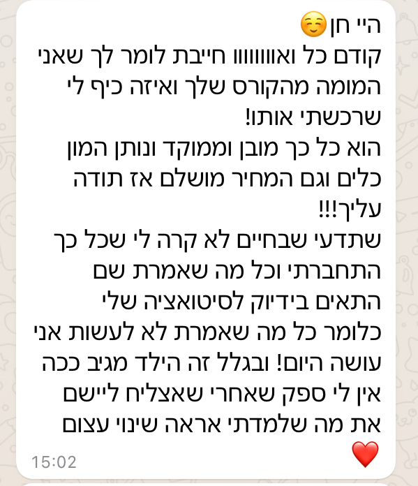 ״הילד יותר קשוב אליי וההתנהלות בבית יותר רגועה ושלווה. הגישה של חן פשוט מותאמת לדור של היום״